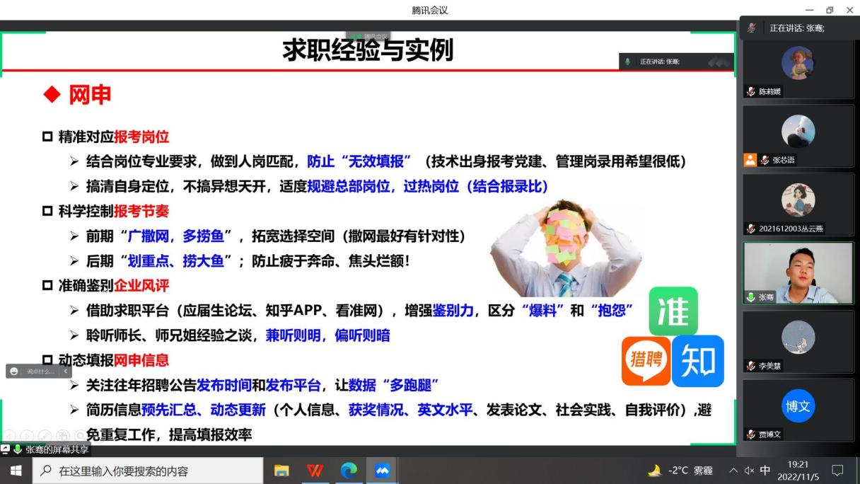 “十佳研究生”张骞,为学院研究生开展了一场专业内就业的云端经验分享会。本次会议由学院就业兼职辅导员张芯语主持。