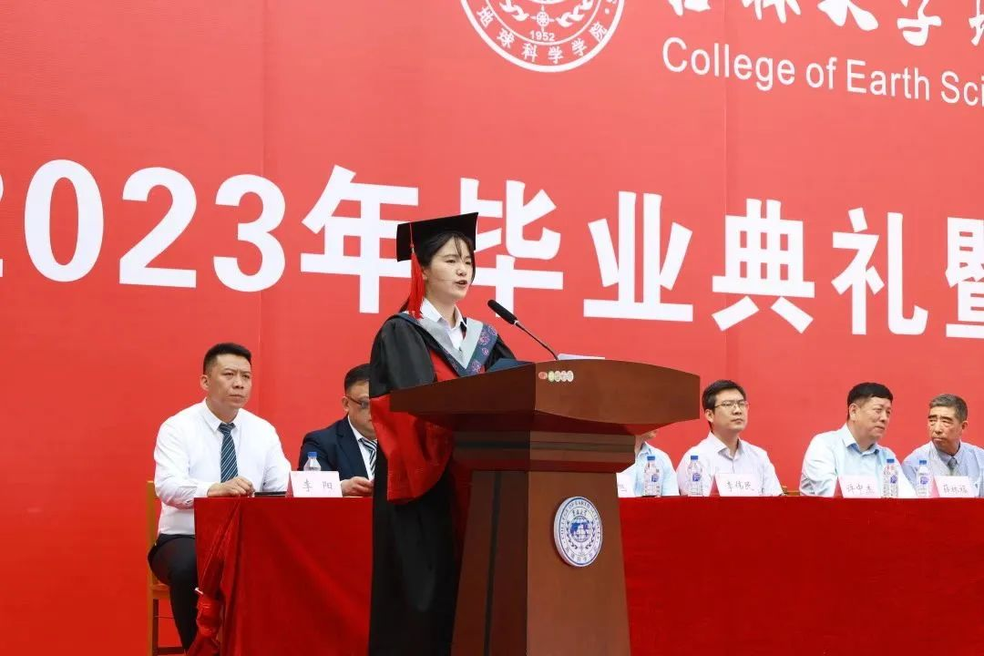 本科生代表刘春龙饱含对老师们的感激之情,满怀热情讲述了在这里对地学院蓬勃发展的见证;讲述了自己在这里积淀了广博浓厚的文化内涵;讲述了自己在这里砥砺了团结坚毅的思想品格。他以风华正茂奋烈时、少年壮气犹未尽祝愿同学们保持少年人的澄澈,奔赴星辰大海。同时对恩师与母校送上了诚挚的祝福。