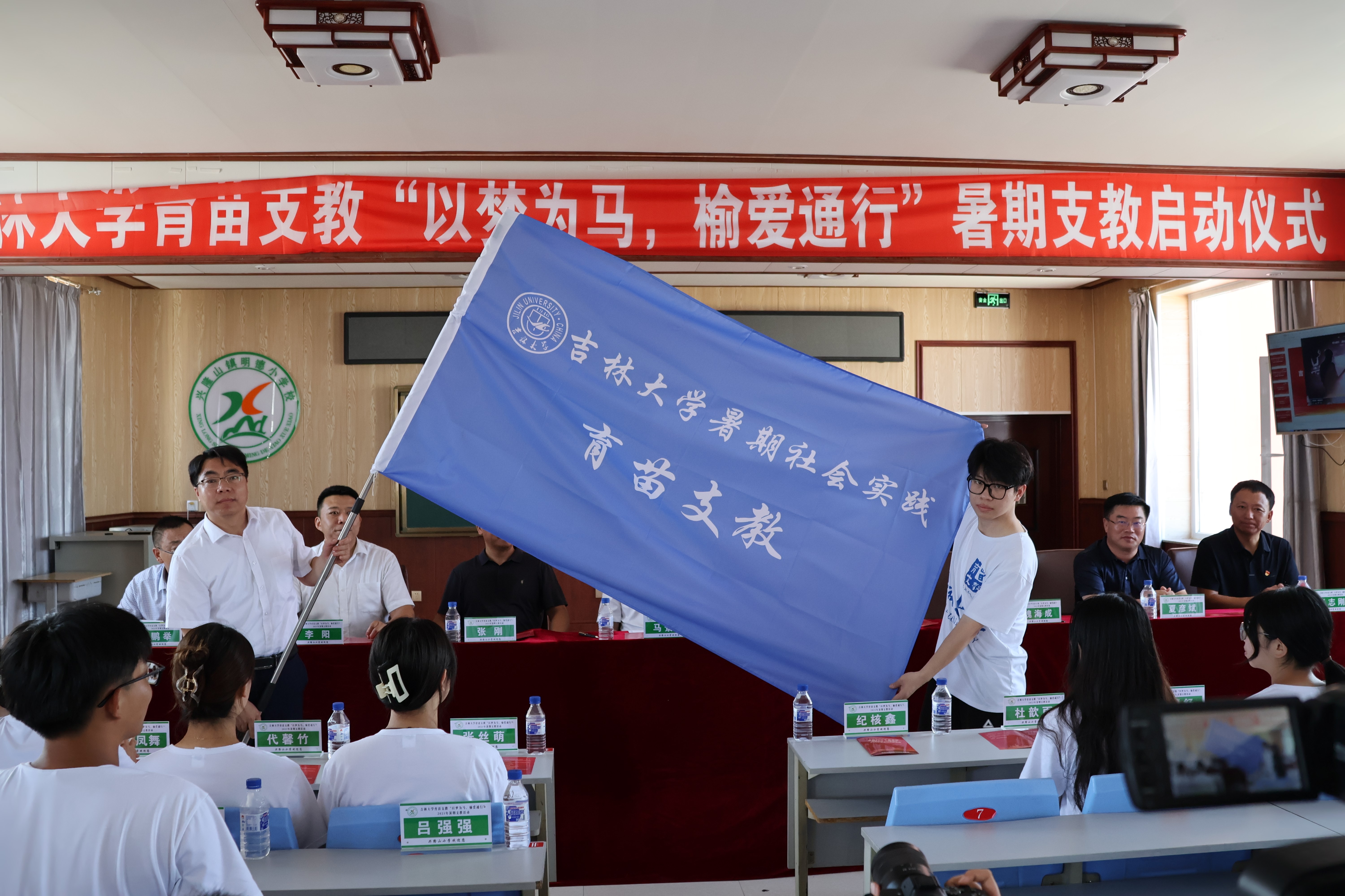 育苗支教社团暑期社会实践”授旗仪式。最后,通榆县兴隆山镇明德小学学生代表向中文字幕