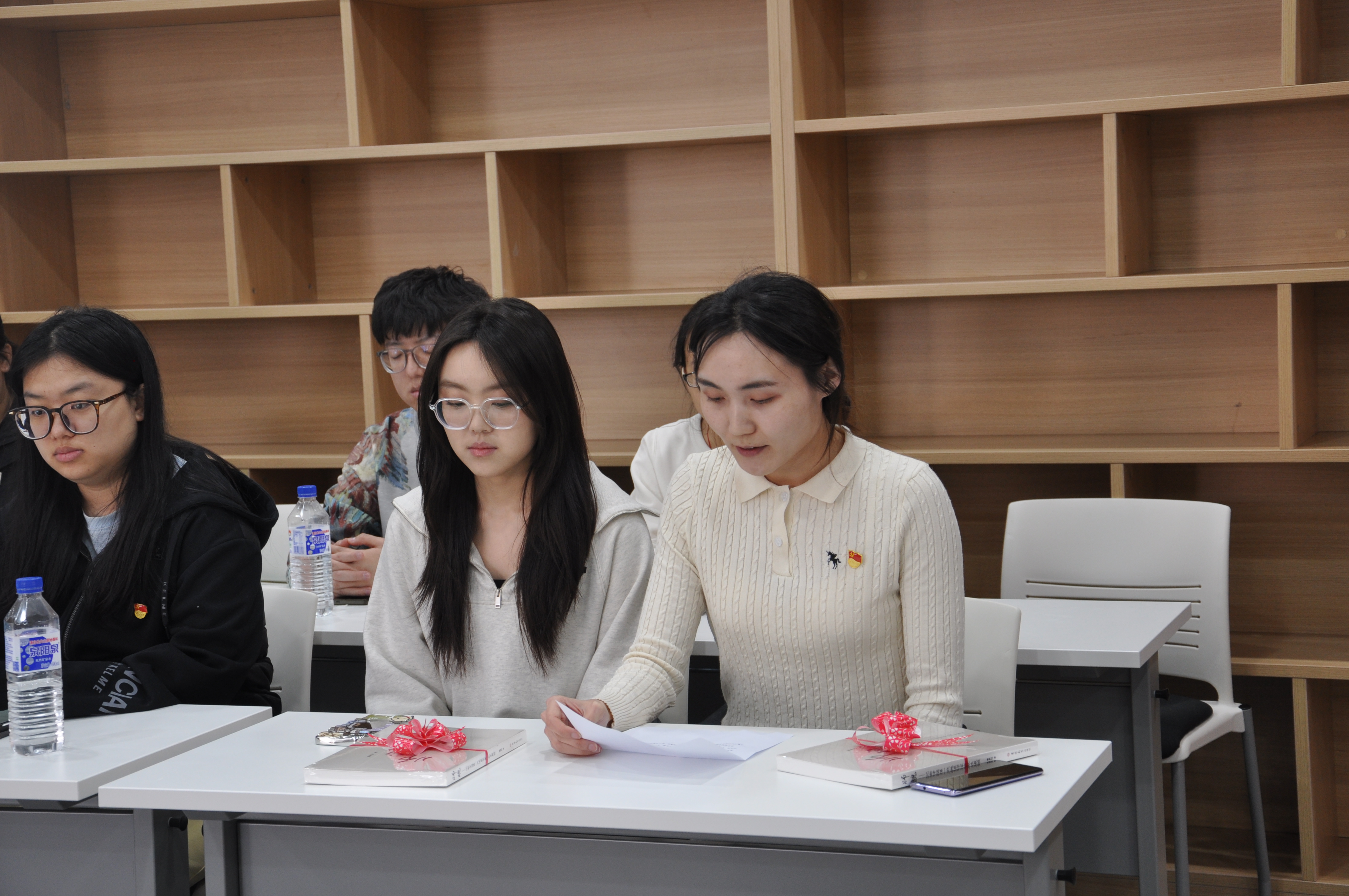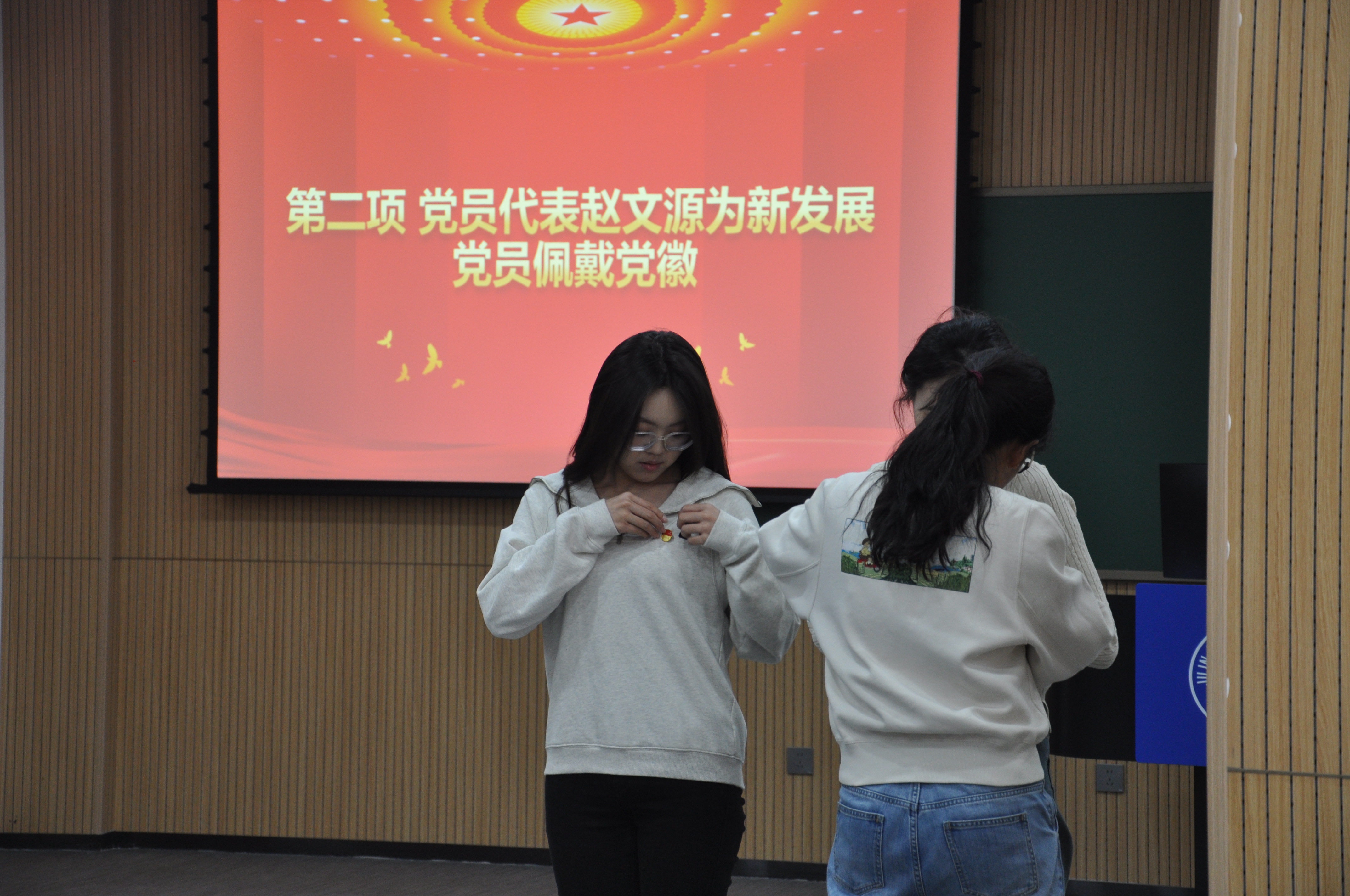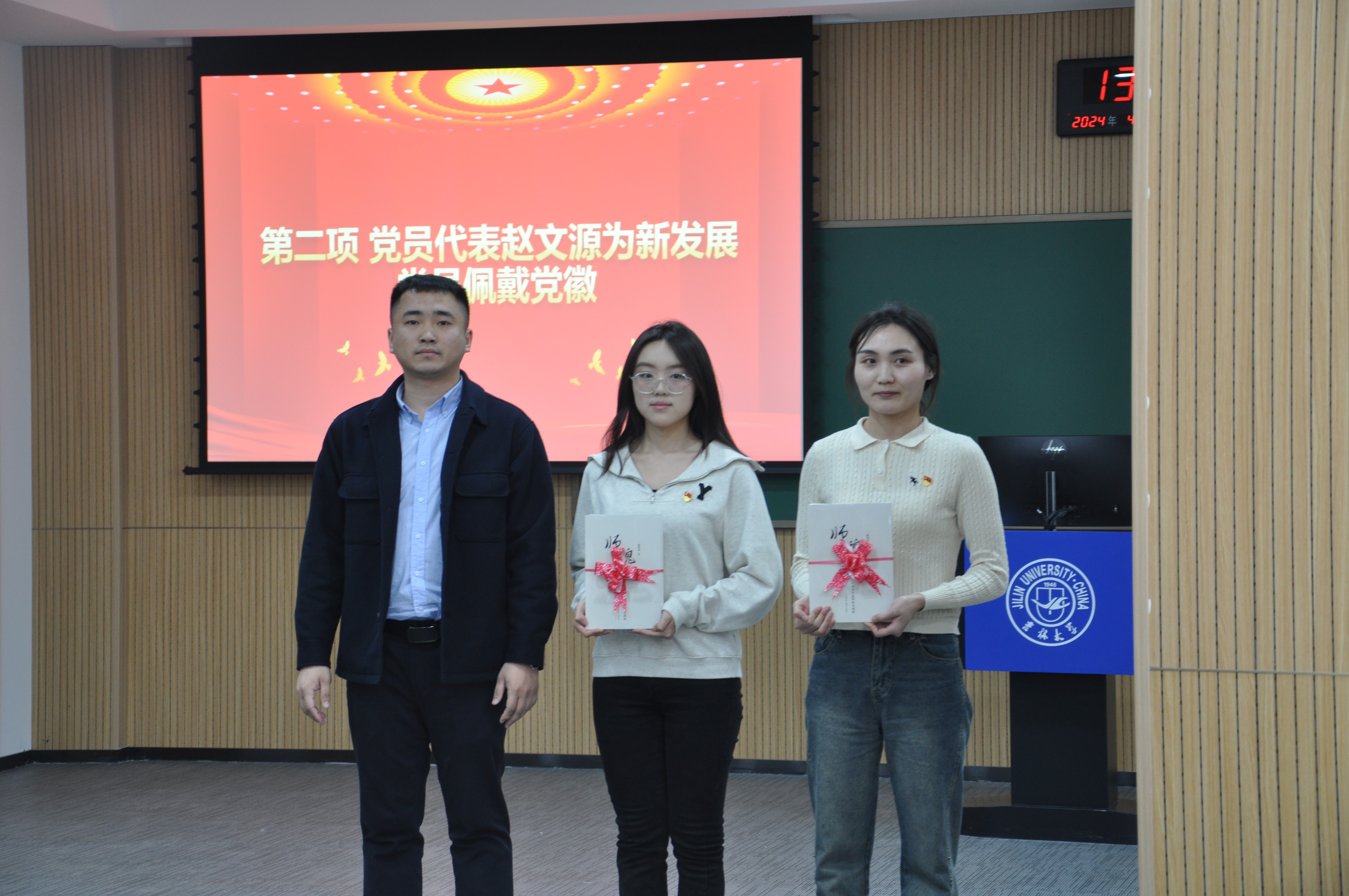 宣誓仪式在雄壮的《国际歌》中拉开帷幕。随后,老党员代表为新发展党员佩戴党徽,研究生辅导员姜鹏老师为新发展党员赠送《师魂-记新中国第一代地质学家张秋生》书籍。新发展党员在马旭副书记的带领下,面对党旗,紧握右拳,庄严宣誓,以铿锵有力的誓言宣示着永远跟党走的决心。接着,新发展党员代表进行了发言,表示要始终忠诚于党和人民,以身边的优秀党员同志为榜样,不断加强理论学习,提高思想认识水平,将智慧和热血融入到党和国家的伟大事业中去。紧接着入党积极分子代表进行了发言,表示要经常检查和弥补自身不足,始终保持与党组织的密切联系,认真学习党的理论知识,以高标准严格要求自己,争取成为一名合格的党员。