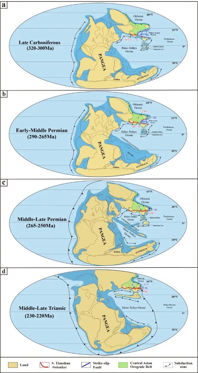 南天山缝合带的区域构造特征显示其在晚石炭世—二叠纪期间经历了由汇聚碰撞向区域性伸展的转变,并引发了一系列的后碰撞岩浆作用。来自蓝片岩、榴辉岩等高压变质岩的地质年代学证据显示其峰期变质年龄集中于早石炭世,部分榴辉岩在早二叠世退变质为了异剥钙榴岩。缝合带上覆地层中的二叠纪陆相磨拉石证据、化石证据表明南天山洋在晚石炭世完成了闭合。多条穿插高压变质带的花岗岩脉也将南天山缝合带的形成时代限定在了晚石炭世。在石炭纪期间,哈萨克斯坦—伊犁地块内发育的一系列增生杂岩和弧岩浆岩是对塔里木克拉通北向俯冲活动的反应,其中一部分被推覆到了塔里木克拉通北缘的被动陆缘沉积物之上。