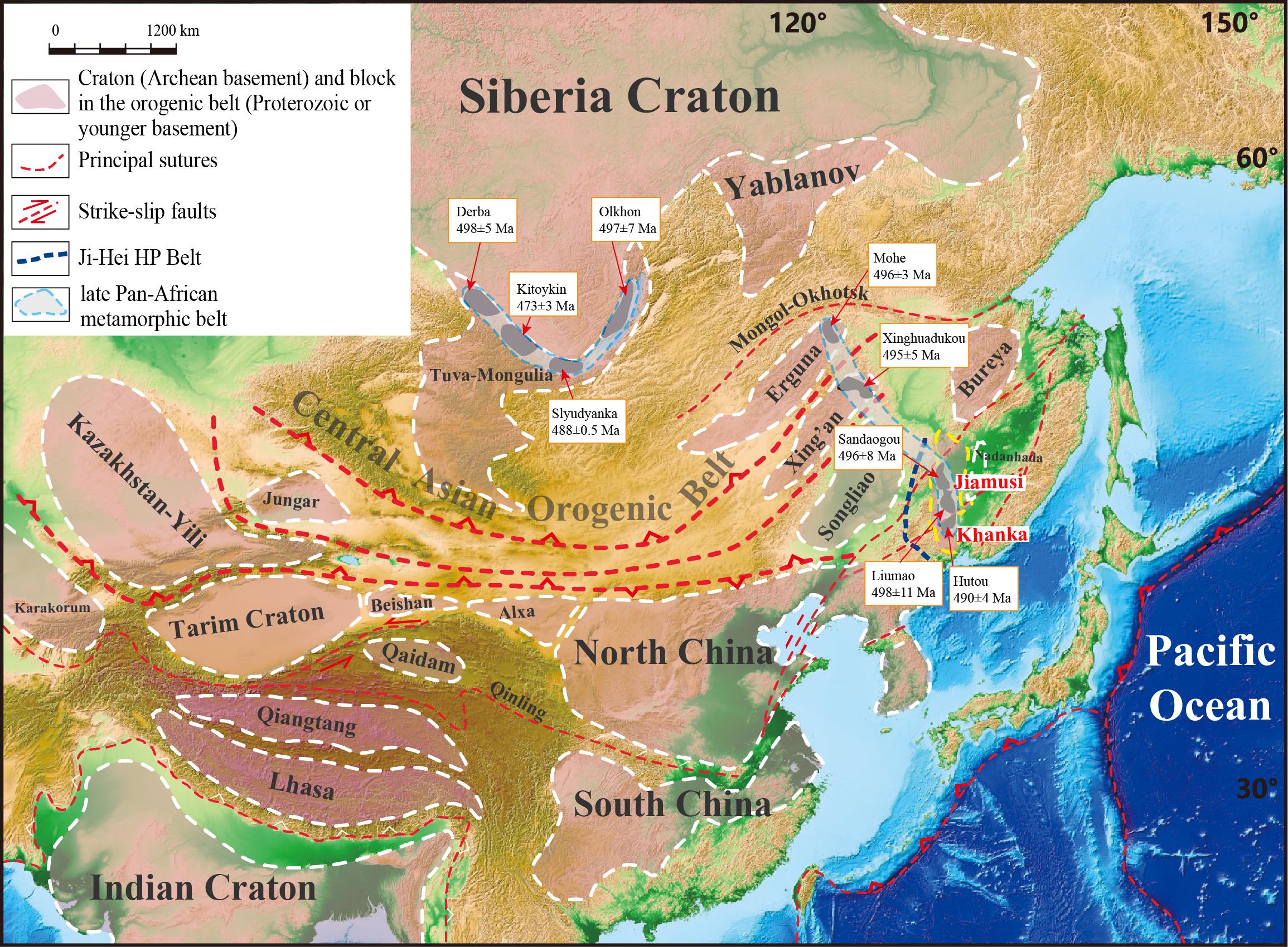 古亚洲洋与古太平洋构造体制之间的叠加与转换过程,一直是国际地学研究的重大科学问题。然而直到目前,两大构造域转换的具体时间、转换过程与动力学背景等存在诸多分歧。佳木斯地块位于中亚造山带的最东缘,也是古亚洲洋与环太平洋构造域叠加与转换的核心(图1),记录了丰富的古大洋构造演化的关键信息。因此,对佳木斯地块进行系统性的研究和总结,对详细刻画中亚造山带东段古大洋构造体制转换过程具有重要意义。
