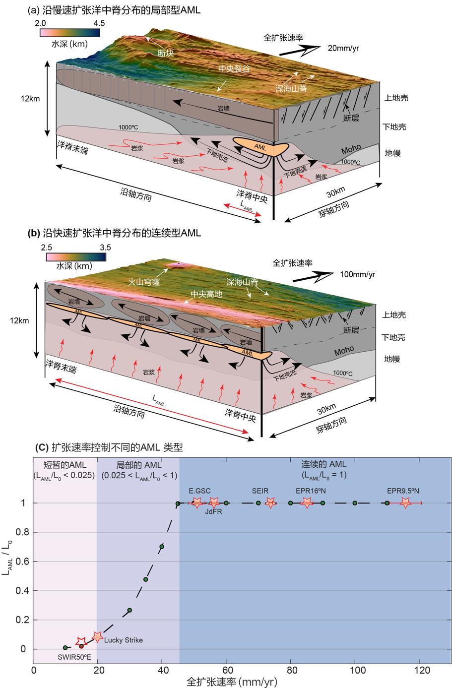 大洋板块扩张中心是全球最主要的火山活动带,其产生的大洋地壳覆盖超过60%的地球表面。然而,地幔熔融的岩浆如何增生成洋壳并没有完全被人们理解。 随着近些年海洋多道地震(MCS,multi-channel seismic)成像技术的发展,扩张中心下覆轴向壳内岩浆房AMLs(Axial Melt Lens/ Axial Magma Chambers)的大小和深度等几何特征有了非常好的约束。地震数据揭示AMLs具有三个明显的特征:1)形状不规则,并且在三维空间上发生叠置和跃迁(Kent et al., 2000);2)AMLs内部熔融程度不均一,由多个垂向叠置的水平岩席体组成(Carbotte et al., 2020);3)从全球尺度来看,快速扩张洋中脊的AMLs在洋中脊走向方向上连续分布(Carbotte et al., 2013),而慢速扩张洋中脊的AMLs仅有可能分布在每一个洋脊段中央(Singh et al., 2006)。这些观测甚至改变了人们对岛弧和板内岩浆系统的重新思考(Cashman et al., 2017)。有意思的是,具有这些特征的轴向岩浆房如何形成目前并没有理论机制。特别是,AMLs 内部水平分布的岩席体如何在伸展构造环境下形成?AMLs为什么会在快速扩张洋中脊沿轴连续分布?而在慢速扩张洋中脊仅在洋脊段中央集中分布?