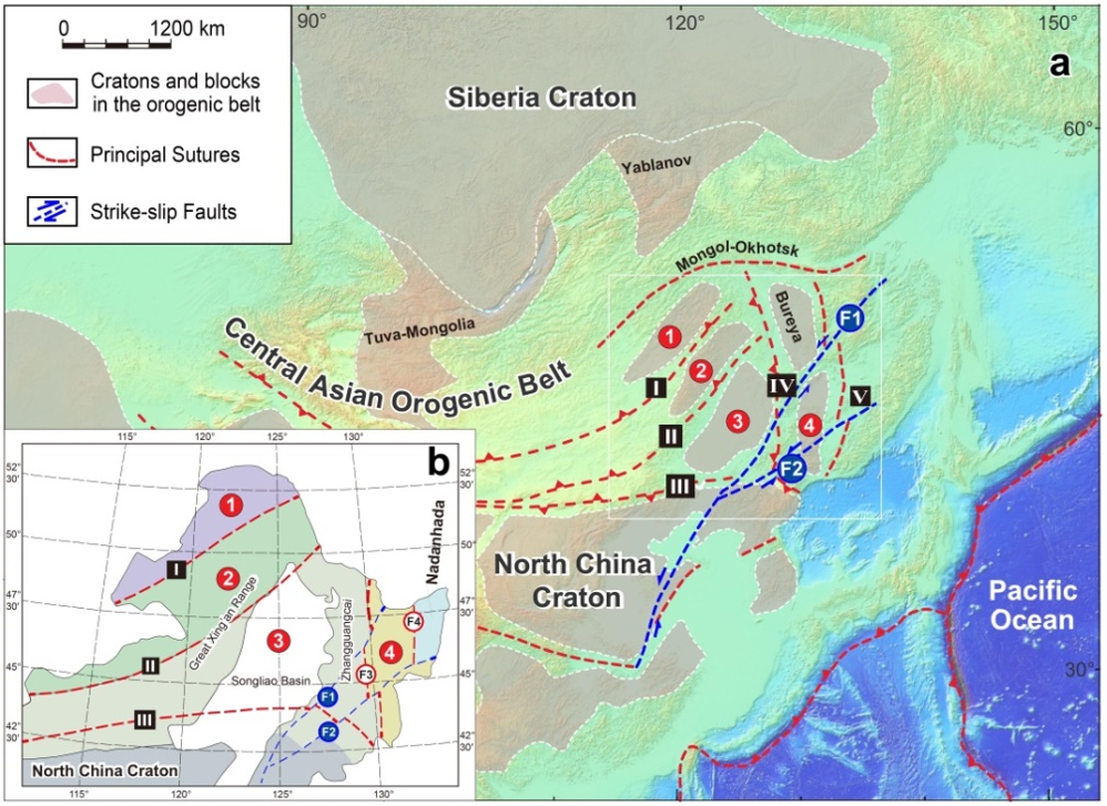 中国东北位于中亚造山带东段,有多个微陆块及其间的缝合带构成(图1)。独特的大地构造位置与多个古大洋构造体制的叠加作用使得中国东北地区保存了大量洋-陆相互作用、陆-陆碰撞以及陆壳增生等大量关键地质记录。这些古缝合带不仅是分隔微陆块的界限,更是东北地区大陆增生的地质证据的关键载体。总结中国东北缝合带的组成与性质,对明确中国东北的演化历史和古亚洲洋–古太平洋的构造叠加与转换过程具有重要意义。