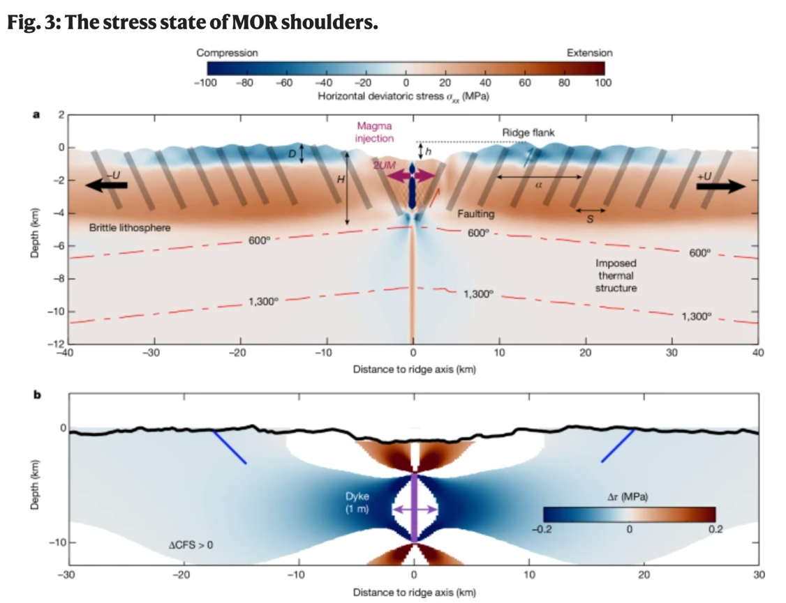 为了检验离散板块边界发生构造缩短动力学可行性,作者们进一步开展了二维的地球动力学数值模拟研究。模拟的结果显示,对于一个具有中央裂谷的对称型洋中脊,新生洋壳在中央裂谷内发生挠曲(Bending),这种挠曲作用会随着新生洋壳从裂谷中心离轴出来的时候释放(unbending),从而产生S一个水平压缩区域(图3.a,在这个区域内,水平偏应力超过~10MPa,达到压缩莫尔-库伦破裂阈值,应力峰值位于离轴约15 公里处,与发生逆冲地震的空间位置重叠。