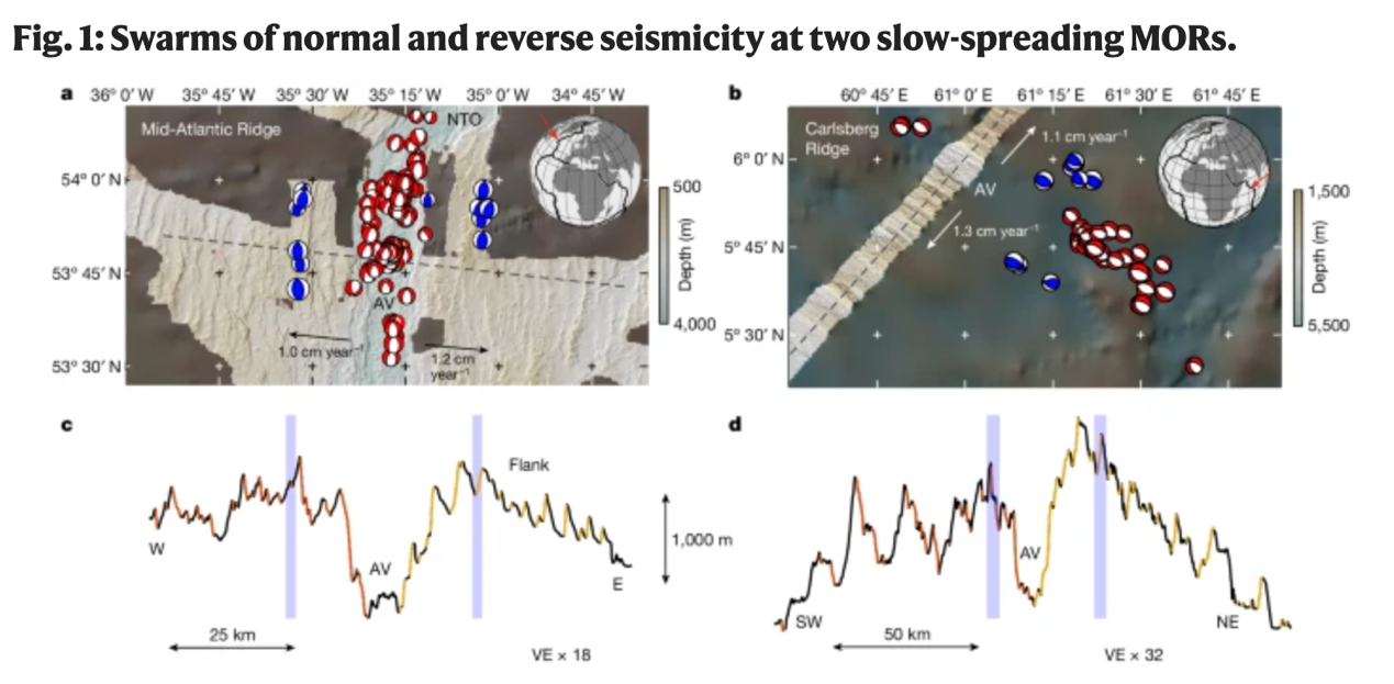 2022926日,位于北纬54°的北大西洋洋中脊发生了一个震级大于4的正断层地震活动。该地震事件持续了大约80小时,并发生了从的迁移。在该地震事件向南迁移的过程中,在距离新火山轴以东15公里处的一个断层面上发生了一次5.1级的逆断层地震,表明新生大洋中脊正在发生构造缩短。在2022929日至202314日期间,又发生了11次震级高达5.9级的逆断层地震事件,这些地震活动对称地分布在新生火山轴两侧大约15公里处的两个狭窄区域内(图.1a)。受到该次地震活动的启发,作者们发现早在201411月,在西北印度洋的卡尔斯伯格洋中脊上也发生了类似的地震序列(图.1b