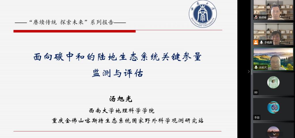 本次报告邀请到西南大学教授,博士生导师,重庆市巴渝学者青年学者汤旭光老师,报告的题目是“面向碳中和的陆地生态系统关键参量监测与评估”。报告会由中文字幕