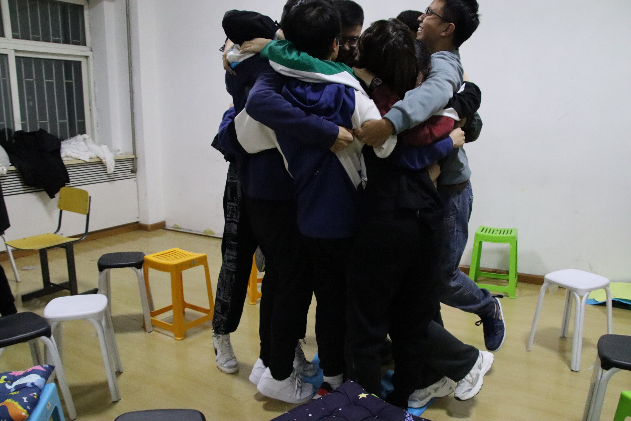 了解阶段通过“一分钟鼓掌”和“我知道”环节。同学们相互了解,放松身心,参与热情得到极大提高。团结阶段中,同学们通过“信任之旅”、“集体登录”和“人体字母”三个小游戏,培养了团结意识,搭建了信任桥梁。,在“信任之旅”中,同学们两两一组,共同努力成功避过各种路障,到达终点。“集体登陆”中,同学们以组为单位集思广益,根据每个人的特点合理分工,最终集体“登陆”两张A4纸,顺利完成任务。