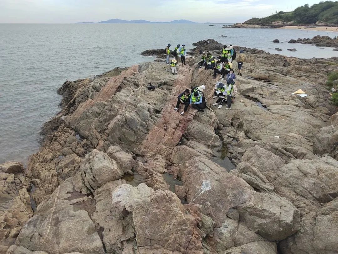 第三日,我们又回到了海边,这次是钓鱼台路线,站在钓鱼台三礁揽胜之地,近看细粒正长岩、石英闪长岩、花岗伟晶岩与似斑状二长花岗岩互相穿切,判定岩层新老先后;远观海蚀墩、海蚀崖、海蚀残丘与波切台地交相辉映,展现海蚀地貌特征。站在礁石之上,我们绘制了岩层穿切关系图。早早的完成了实习任务后,我们说笑着向着妈祖庙前进,可惜由于部分因素影响未能进入。最后全班同学与老师背对海洋,拍摄了纪念照,站在岸上公路旁,俯瞰海洋,不禁感慨实习之旅实在充满乐趣,也使得同学们更加期待接下来的几条调查路线了。