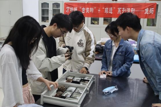活动开始,外院同学对实验室陈列的化石标本表现出极大兴趣与热情,代金韬结合教学化石,讲解了古生物、化石、化石的类型等古生物基础知识,并解答外院同学的问题。