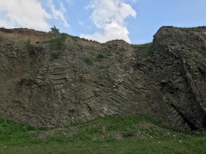 第一个到达的地点是西尖山。此时阳光明媚,天空万里无云,山路虽有些崎岖,但道路两旁茂盛的丛草送来阵阵清新,同学们朝气满满,跟着带队老师,不一会儿便来到了西尖山前。许是太久远离自然,抑或是从未与自然如此近距离接触,当同学们看见成堆成簇的柱状岩石时,纷纷被大自然的鬼斧神工所吸引,它们如一把立在大地上的巨型铅笔,整齐壮观。大家观察了几分钟后,老师开始向同学们介绍此处火成岩的成因,岩性等等内容,同学们聚精会神,生怕错过重要的知识点。待大家掌握,老师又指导同学们组队测量产状,并绘出素描图。约莫十点半,所有班级完成测量任务,大家兴奋地赶往大巴车,前往下一个地点——大孤山。
