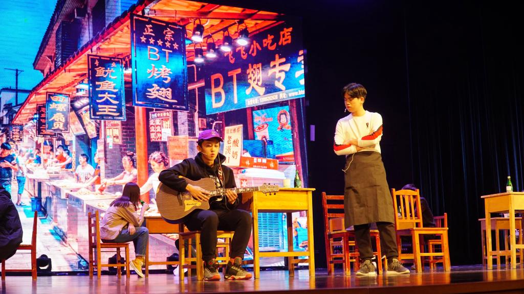 接下来是王锶淼等同学带来的小品《午夜排档》。小品讲述了一个普普通通的街边大排档里的民生百态。那位失业的青年,还有隔壁的烤鱿鱼摊主,这人生百态,有时候或许就会被生活被镌刻在这些不起眼的地方。过去不可以改变,不过我们不能放弃自己的理想,坚持下去,在最好的年华,做最好的自己。