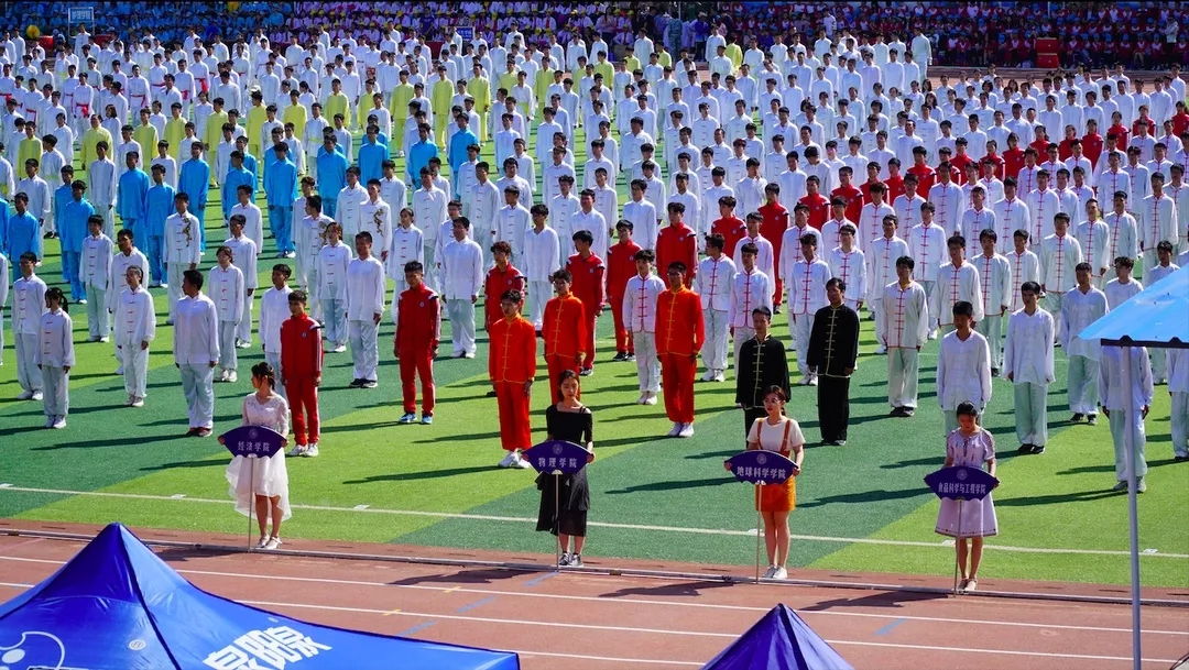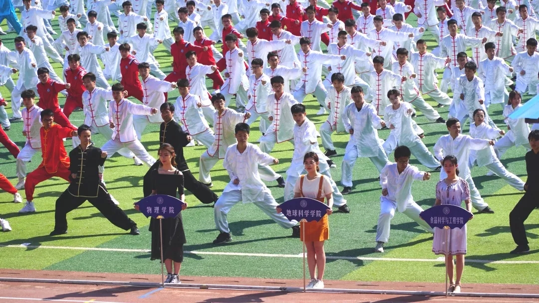 首位出场的是万众期待已久的“三路长拳”表演者!进场之后,听从领导的指挥,行抱拳礼,蓄势待发!音乐响起,一排排昂首挺胸的“小白人”随着音乐起势,跟着节奏,循着指令打出动作,一招一式都充满力量!没错,最整齐的那一组同学就是我们中文字幕