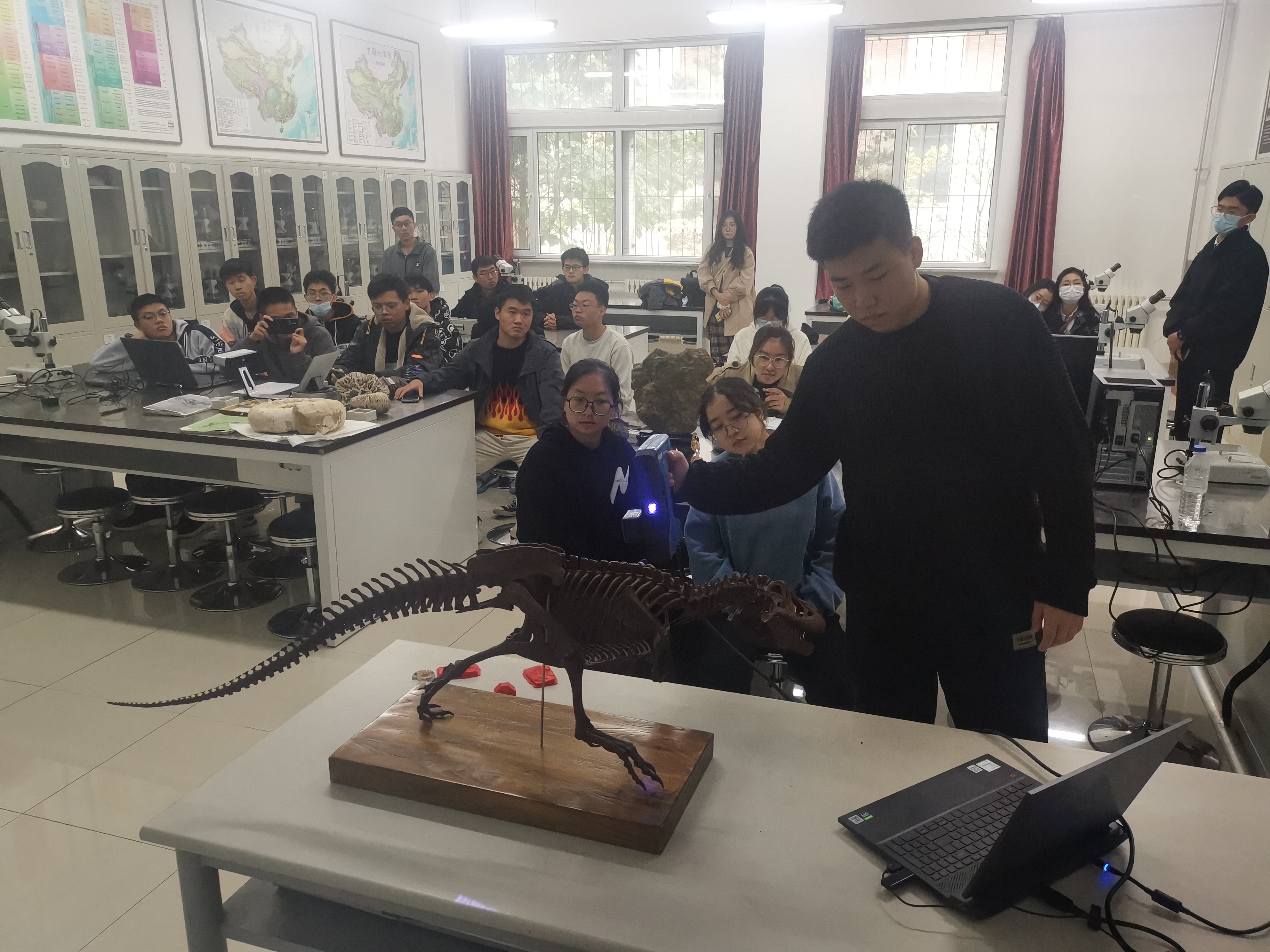 进入实验室的同学对古生物化石表现出强烈的兴趣,反复观察、拍照、发朋友圈,并对古生物、地质类及专业学习等感兴趣的问题进行咨询(图1)。活动伊始,杨韩涛老师介绍了地学基础实验教学中心的基本情况、古生物学实验室的实验教学活动及丰富多彩的课外实践活动,“地质+”双创基地的“化石3D数字化保护”、“无人机实景三维建模”、“化石文创开发”等创新创业活动,鼓励同学们积极参加专业实践活动,不断开拓自己的创意思维(图2)。杨老师对 “远古的呼唤——云南禄丰龙化石科考发掘”活动(央视总台2021年生物多样性大会COP15十一大型直播)进行点评,介绍了化石科考发掘以及化石如何进行3D扫描打印的数字化采集、修复及化石保护。实践活动部分,恐龙演化中心的王陇翰博士,利用手持扫描仪,对实验室内的1/10微缩恐龙模型进行扫描,重演了禄丰龙科考工作3D数字信息采集过程(图3-4)。之后,在实验室王欢老师、赵立敏老师指导下,同学们亲自动手操作桌面型扫描仪对三叶虫、菊石等化石进行了扫描(图5-8)。活动中,杨老师演示了三叶虫化石3D打印,展示了往届同学制作完成的化石模型。本次扫描的化石数据,活动结束后会陆续打印出来,并指导同学完成模型抛光、上色等后续处理工作。