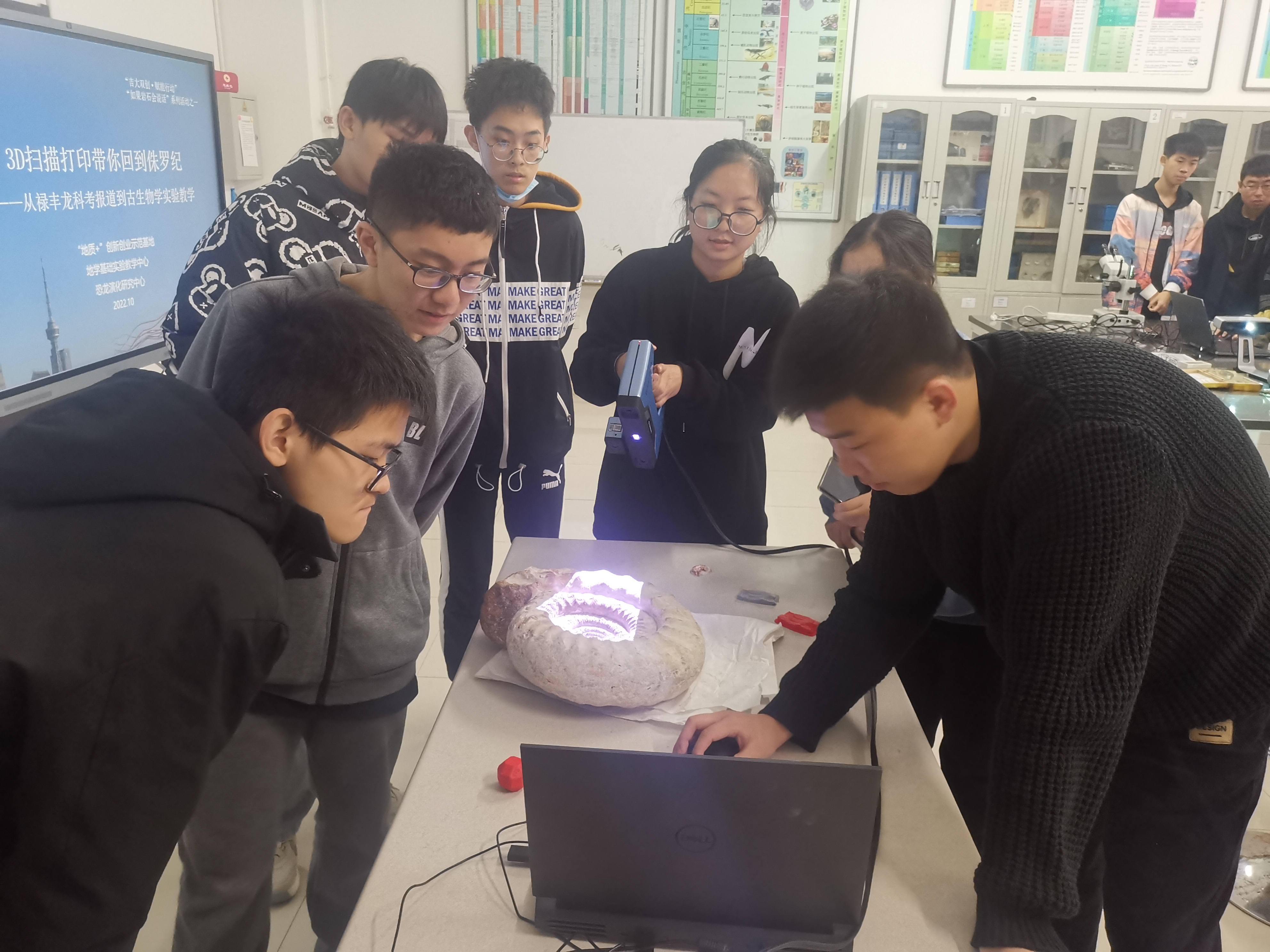活动通过禄丰龙科考挖掘科研实践活动的室内再现,指导学生运用各式3D扫描仪亲手扫描三叶虫、菊石等古生物化石,让大家深入了解古生物学科考工作过程、了解先进科学技术如何使“古老”、“传统”的地质工作重新焕发青春光彩。