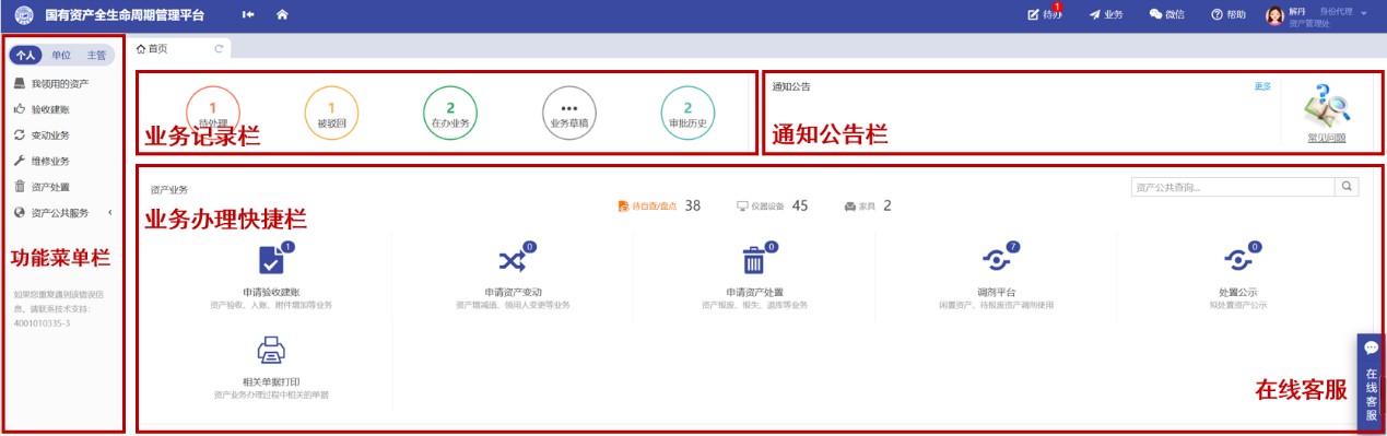 国资平台秉承用户办理业务“只进一扇门”的管理理念,系统中文字幕集成了5个模块:功能菜单栏、业务记录栏、中文字幕公告 栏、业务办理快捷栏、在线客服等。