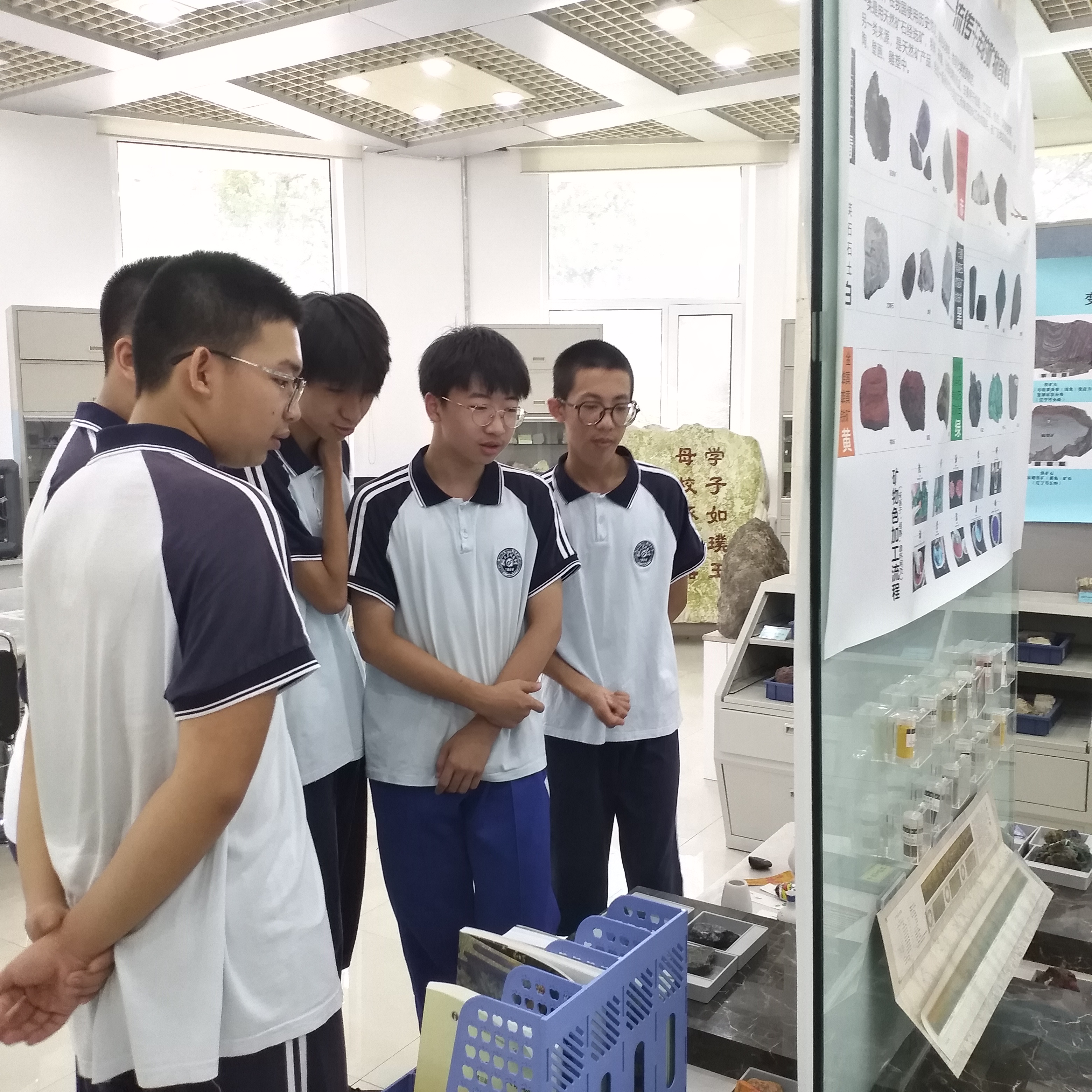 在地球物质综合实验室,同学们系统的参观了多姿多彩的天然矿物、常见岩石、珍稀矿石、瑰丽构造标本,为矿物岩石美丽的颜色、独特的形貌所吸引。在矿物颜料展区,同学们对矿彩产生了极大兴趣,热烈讨论矿物颜料的制作方法、中国传统绘画作品、五行及五色。通过实验室老师对矿物用途的讲解,同学们意识到生活中的建筑、装饰、化工、冶金、医疗等诸多方面都离不开矿物与矿石,激发了大家探索自然奥秘的兴趣。
