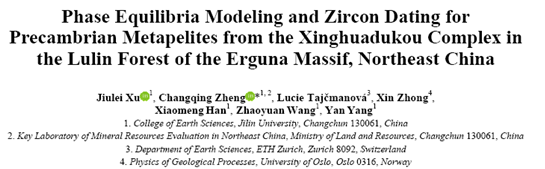 以上研究成果在线发表在地学SCI期刊Journal of Earth Science(Xu, J.L., Zheng, C.Q., Tajčmanová, L., et al., 2018. Phase Equilibria Modeling and Zircon Dating for Precambrian Metapelites from the Xinghuadukou Complex in the Lulin Forest of the Erguna Massif, Northeast China. Journal of Earth Science, 2018, 1-15. DOI:10.1007/s12583-018-0843-z.)。