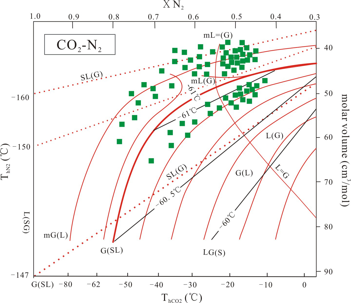 包裹体岩相学研究表明,矿石石英中发育气相、富气相、含CO2及气液两相四种类型原生流体包裹体(图1),根据测温过程中包裹体复杂的相变特征、相变温度(图2)及单个包裹体激光拉曼光谱成分分析(图1),证明成矿流体为一类成分复杂的富N2流体体系,各类包裹体中N2CO2含量变化大(图3),排除了不同类包裹体为原始均匀流体不混溶作用结果的可能性;结合氢--氮同位素分析结果,提出成矿流体为岩浆来源NaCl-H2O-CO2体系热液与变质富N2流体混合产物的新认识。成矿流体中大量N2气的加入,有力促进了白钨矿的沉淀,是白钨矿矿床形成的重要机制。