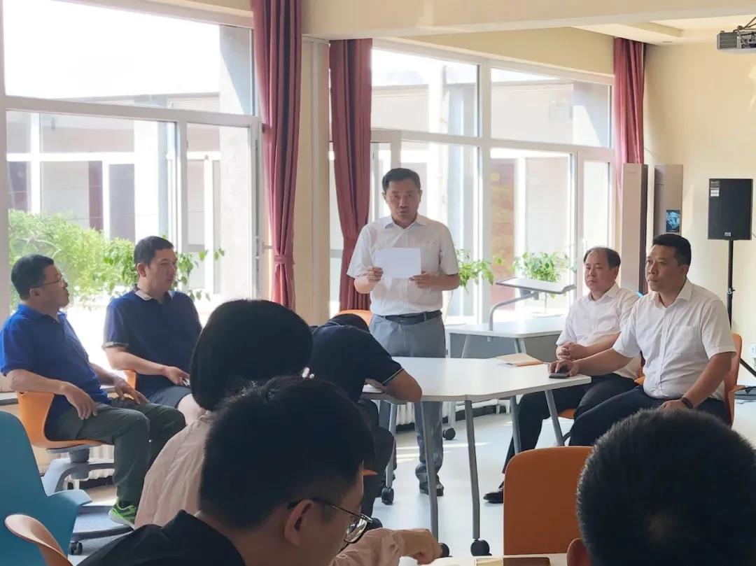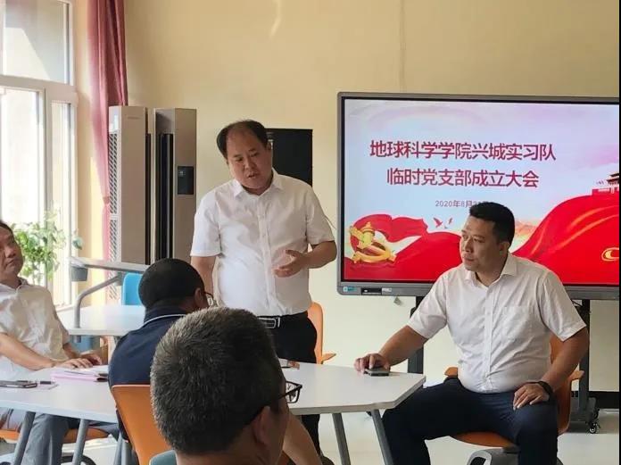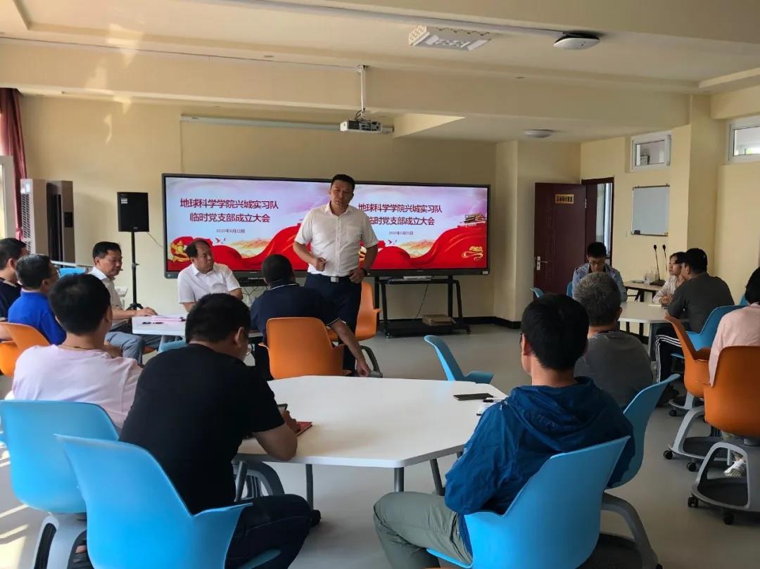 地学基础教学实习队临时党支部成立大会在兴城教学基地研讨室召开,学院党委书记杨洲、院长单玄龙等同志出席会议,参加此次教学实习的全体教师党员参加了会议。
